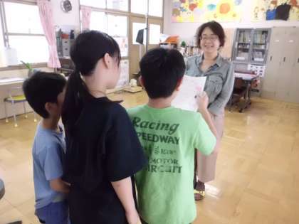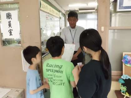 くすのきクイズの賞状とプレゼントが完成したので、渡しに行く練習をしました。