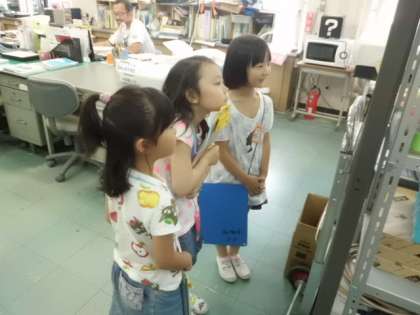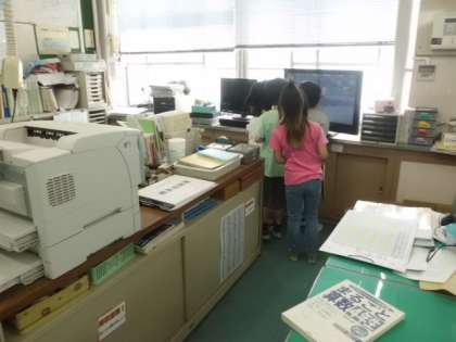 学校探検では,普段なかなか入れない部屋にも入れてもらいました。事務室,職員室,音楽室,家庭科室などなど様々な部屋に入って興味津々のみんな。職員室にある大きなテレビ画面を見て…,「何がうつっているんだろう…。」と真剣なまなざしで見ていました。他にも色々な物が置いてある部屋を真剣に見てまわる2年生でした。