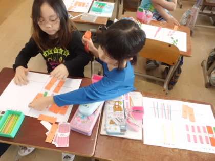 算数では,繰り下がりのある筆算を学習しています。今日は,繰り下がりのある筆算をどのように計算するのか,数え棒を使って考えました。自分が考えた計算の仕方を2人学びで話し合い,みんな学びで交流しました。これからもたくさん繰り下がりの筆算の問題に取り組んでいきます。
