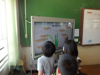 理科の学習でオスとメスのメダカを見分けるためにゲームをしました。オスのメダカコースを選べば,オスのメダカをつかまえるたびに10点,メスのメダカをつかまえてしまうと10点減点。楽しみながらオスとメスを見分けていました。
