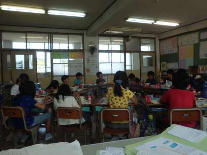 給食係がくじを作ってくれて,毎日日直がそのくじを引き,給食の食べる席の形を決めています。今日はみんなで三角形になって食べました。わいわい楽しそうに食べていました。