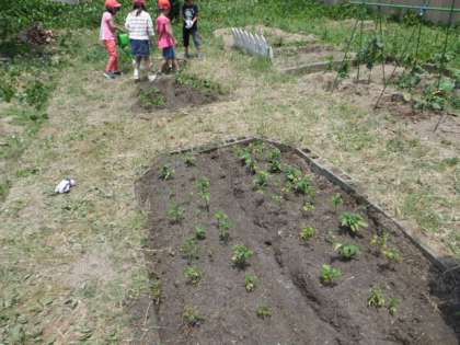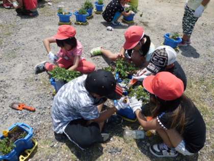 ミニトマトの植え替えをしました。畑を耕して肥料を入れて,みんなの植木鉢に入りきらない分のミニトマトの苗を植え替えました。「黄色い花がさいている」「ちょっと葉っぱがかれているところがあるよ。」と観察したことを報告してくれました。これでまたどんどん大きく成長してくれることでしょう。