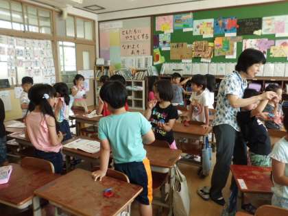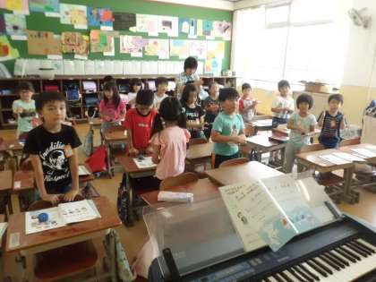 音楽の学習で「みんなで あそぼう」という曲に合わせてリズムの学習をしました。