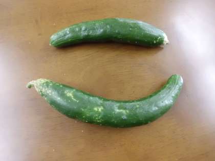 収穫したキュウリで文字作り。「こ」や「り」を作っていました。