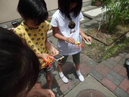 理科の「電池のはたらき」の学習で,今回は光電池を使った学習をしました。モーターに光電池をつなげると,どのような時にモーターが動くかを調べました。教室でつないでみましたが,動きませんでした。「どうしたら動くかな?」と子どもたちに聞いたところ,「太陽の光だったら動くと思う」という意見がでました。そこで早速外へ出て太陽の光を当ててみました。すると,勢いよくプロペラが回りました。
