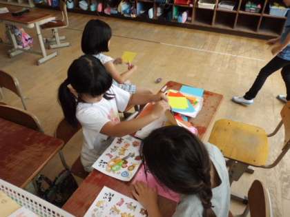 七夕の願い事を書いたり笹飾りを作ったりしています。みんなの願いごとは何かな?