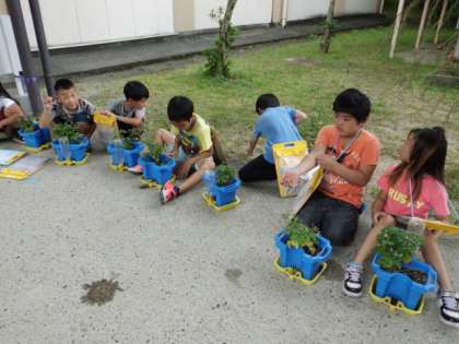 ミニトマトの観察をしました。ぐんぐん大きくなって,たくさん実をつけています。