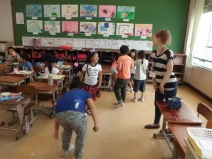 給食の時間にはALTの先生が来てくださいました。「何か質問したい人いるかな?」と聞くと,「どこから来たのですか」「すきな遊びは何ですか?」「なぜ日本にこようと思ったのですか」「お弁当の中で好きな食べ物は何ですか」など次々に質問が出て,にぎやかな質問タイムになりました。給食を食べた後には,昔の遊びを一緒にしてもらい,嬉しそうな2年生でした。