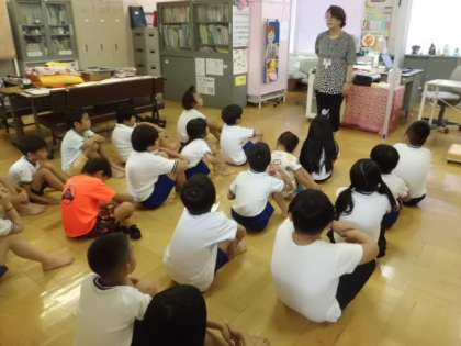 7月6日(木)に身体計測がありました。身長と体重をはかる前に,背骨のことや姿勢をよくしていると血液のめぐりが良くなること,リラックスするための肩甲骨の簡単な体操などについても教えて頂きました。