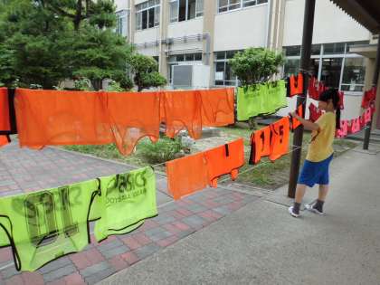 6年生は家庭科の時間に洗濯の仕方を学習し、実際にビブスを手洗いして干しました。