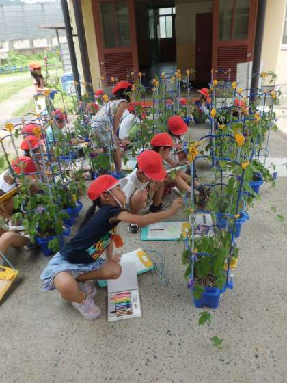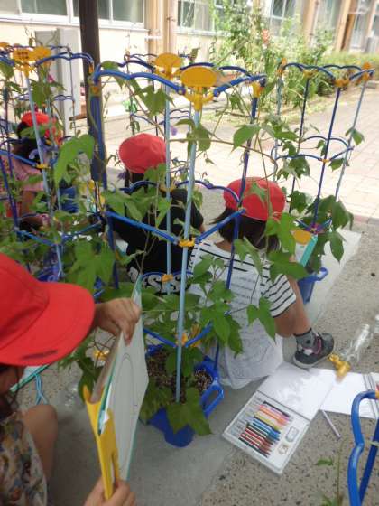 花を咲かせているあさがおもあり,「3つ咲いてる。」とか,「もうすぐ咲きそう。」と友達と言い合っている様子が見られました。