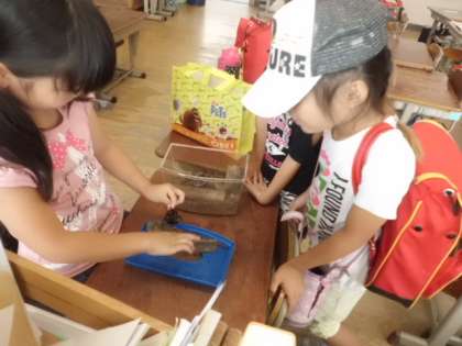 カブトムシブームがやってきました。毎日何人かのお友達が,家からカブトムシを持ってきてくれます。「何でこんなにピカピカな背中なの?」「目がコワイ…」「メスの方がめっちゃゼリー食べる!」など様々な会話が聞こえてきます。教室でカブトムシを飼おうかな…と担任も考え中です。