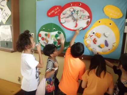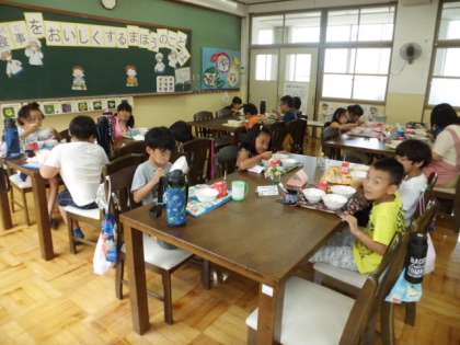 今日はみんなの大好きなランチルームでの給食でした。ランチルームに置いてある物に興味津々のみんな。給食を食べ終わってからは豆つまみをしたり,壁に貼ってある栄養バランス表などをじっくり見たりしていました。