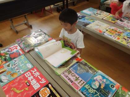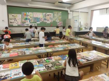 ふれあいサロンに並んだたくさんの本を見て,子どもたちは大喜び。