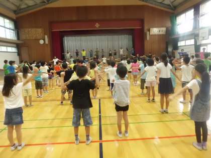 石田小学校の子たちは,7時に集まってラジオ体操をします。