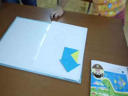 三角形2つをくっつけると四角形に変身することがわかり,楽しんで形作りに取り組んでいました。