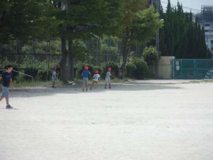 運動場を走り回って,ドッジビー当てを楽しんでいました。