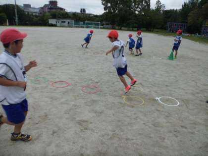 体育「とびくらべ」ではグリコ,川とび,ケンパをしました。また,赤サークルは右足,緑サークルは左足などと決めてとんだり,サークルの場所を変えてより遠くに高くとべるように練習しました。