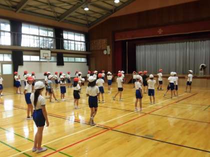 運動会に向けて本格的に練習が始まりました。中学年の団体演技は「エイサー」を踊ります。まずは基本の動きなどを覚えて,何度も曲に合わせて練習しています。