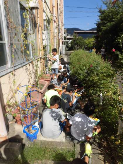 春から理科でツルレイシの観察をしています。夏休みの終わりのツルレイシを観察しました。ツルレイシの実が緑から黄色に変わっていました。これからどんな変化をしていくのかな。