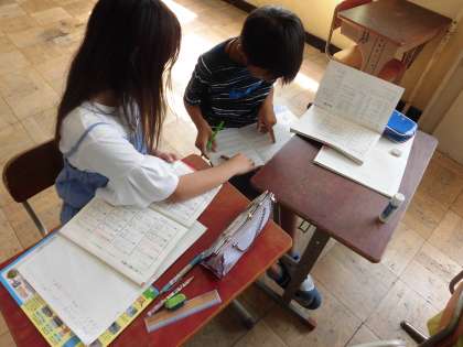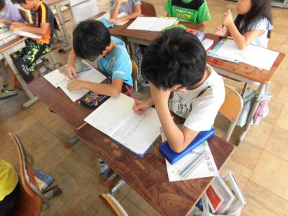 国語の学習で漢字しりとりに挑戦しました。例えば,学校→工事→時間→漢字…というように後ろの字の読み方を使って次の言葉を作るというものです。隣の席の友達としりとりしました。辞書を使って調べている人もいました。