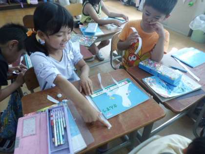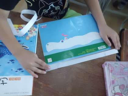 算数の「おおきさくらべ」の学習で,ノートの縦と横の長さを比べる方法を考えました。