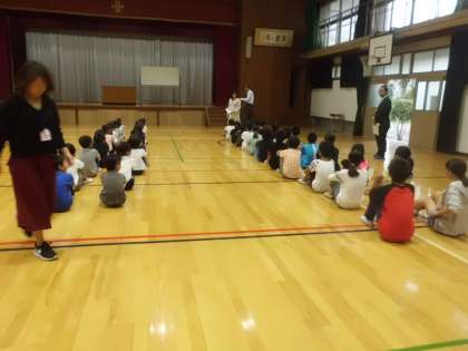 体育館で行われましたが,最初に体育館に入った1年生。