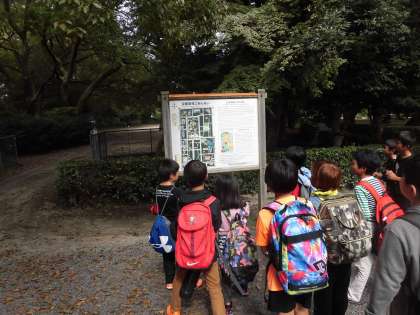 京都府警本部の見学の後,お昼まで少し時間があったので,京都御苑へ行きました。京都御苑とは何かを説明した後,少しみんなで遊びました。おにごっこをしたり,だるまさんがころんだをしたり,どんぐりやきのこを探したりして各々楽しんでいました。