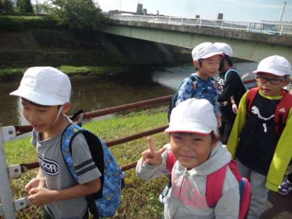 学校から出発して,ルンルン気分で山科川沿いを歩く2年生。シャレを言ったり,しりとりをしたり川を眺めたりしながら歩いていきました。