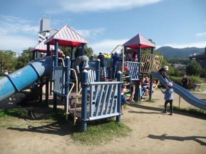 第1休憩ポイントに到着。折戸公園です。みんなが心待ちにしていた公園での休憩です。休憩というより,みんな走り回ったり遊具で遊んだり,とても楽しそうに遊んでいました。