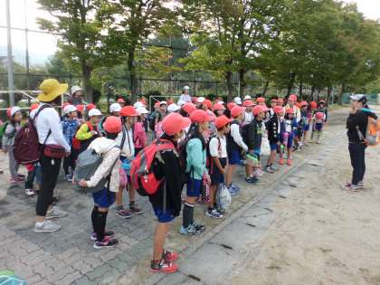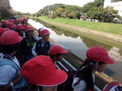 ようやく天候に恵まれ,念願の秋の遠足に行くことができました。出発から途中休憩をした公園までは,低学年と一緒に山科川沿いを歩きました。長い道のりでしたが,川辺にいる様々な生物を見つけて楽しんでいる様子でした。