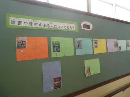 石田小学校のメディア委員は,図書委員と放送委員の2つの仕事をこなします。今日は人権学習に関わって,「障害や障害のある人のことを知ろう」というテーマで本の紹介カードを作成しました。掲示板にはって全校児童に見てもらい,5月の朝会でも委員会の子どもたちから紹介します。