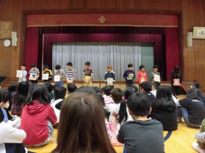 校長先生の話の後,ALTのキンバリー先生の紹介,メディア委員会からの障害に関係する本の紹介と 約30分の朝会でしたが,下井先生から「1年生は,しっかり話を聞けていましたね。」とほめていただきました。
