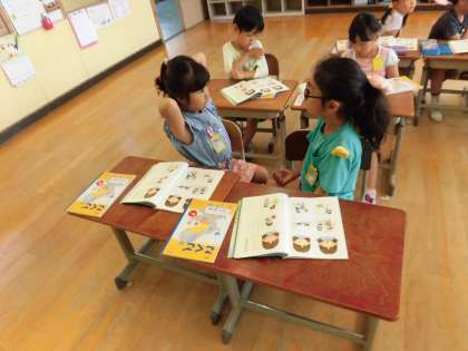あるグループが,向かい合せになって話していることを紹介すると,ほかのグループも真似をしはじめ,「私と一緒なん?」と聞く姿も見られるようになりました。