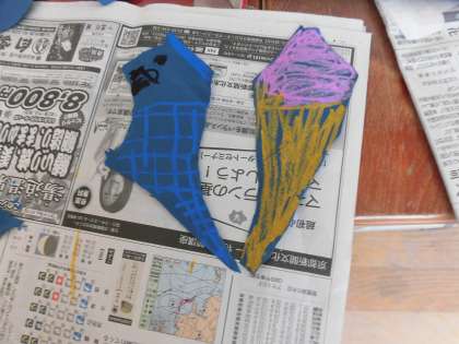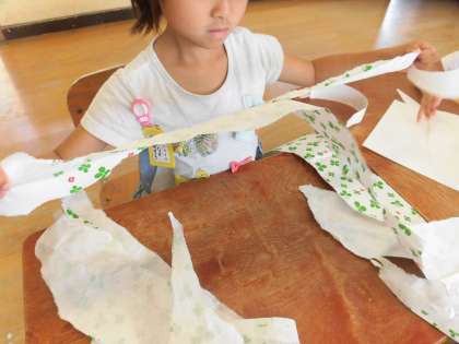 包装紙や紙袋,新聞をそっとやぶいて,やぶいたかたちが何に見えるか考えました。