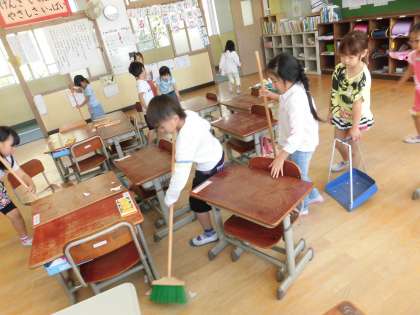 そして,それを見ていた子たちが次々とほうきを取りに行き,掃除を始めました。