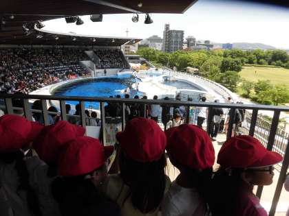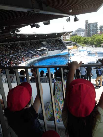 今日は,たくさんの方が来られていて立ち見でしたが,イルカのジャンプを見てみんなで拍手をしていました。