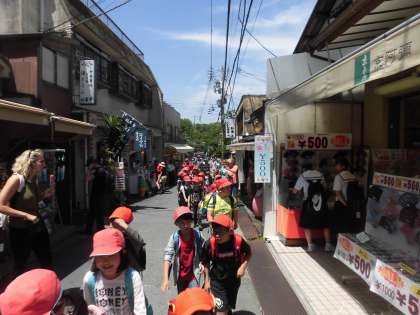 登山口には店が多く並び,外国人観光客の方もたくさん訪れていました。子どもたちは日ごろの学習を活かして「Hello」と英語で挨拶をしていました。