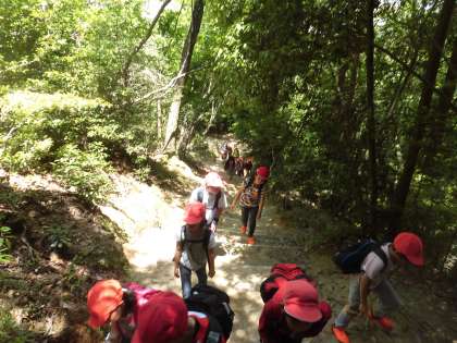 山道に入ると子どもたちは「頑張るぞー」と互いに声を掛け合いながら登り始めました。途中,歩く順番を入れ替えたり適度に休憩を挟んだりして体力を維持しながら登りました。
