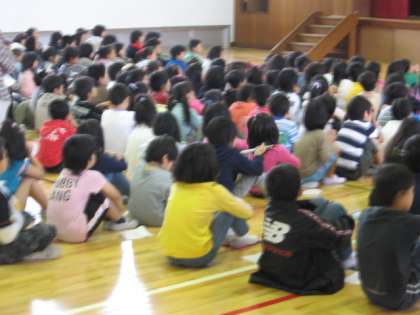 本日,児童朝会がありました。今月から朝会で歌をうたいます。今日は『スマイル アゲイン』を全校合唱しました。子どもたちのきれいな歌声が体育館に響き渡っていまいした。また,5年生が長期宿泊学習での体験をスピーチしました。宿泊学習を通して自然の素晴らしさや,家族の大切さについて発表していました。他の学年からは感想を発表し,感動を共有しました。