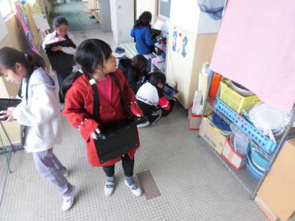 図工科の学習で,学校内にいる「ともだち」をタブレット端末と虫眼鏡を持ち,学校内を探しまわりました。(上の写真に顔に見えるものがあるのですが,分かりますか?今回の学習でいう「ともだち」は,身の回りにあるのもで顔に見えるものの総称です。)