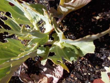 キャベツの葉に何匹もいたモンシロチョウの幼虫が見当たらなくなりました。かろうじて,1匹見つけましたが,葉を食べ進んでいくうちにアオムシの姿がよく見えるようになって,敵に襲われたのでしょうか。自然の中で生きるということは大変なことなのだと感じます。