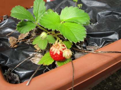 中庭に,真っ赤に色づいたイチゴが2粒できていました。