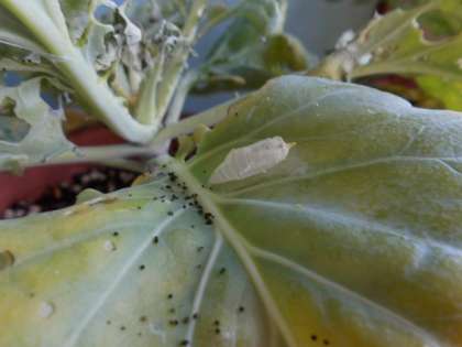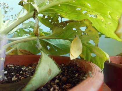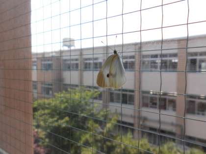 誕生しました。さなぎから,成虫が3匹(3頭が正しいようですが)かえって,教室で飛んでいました。窓から外を見ていた2匹は逃がしてあげて,葉の下でじっとしている1匹は,そのまま様子を見ることにしました。