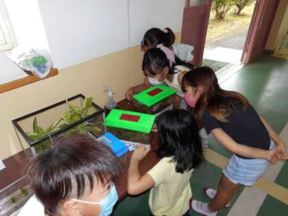 感染拡大防止の取組もステップ4となり,今日は全校児童が登校しました。休み時間に,生物コーナーに立ち寄る子どもたちもいました。メダカのたまごやカブトムシ,カミキリムシに興味をもってみていました。