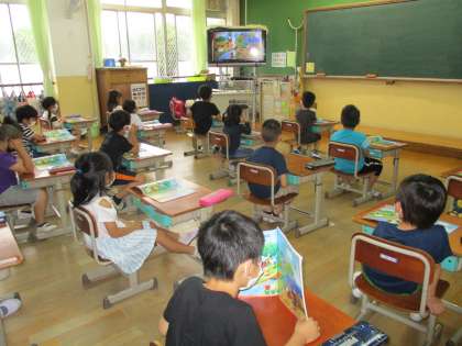 音楽の授業で,絵を見ながら知っている歌を出し合いました。