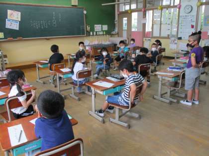 手本を見ながらカードに自分の名前を書き,その後,それぞれの場所で自分の名前と好きな○○を発表しました。