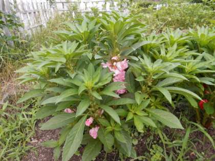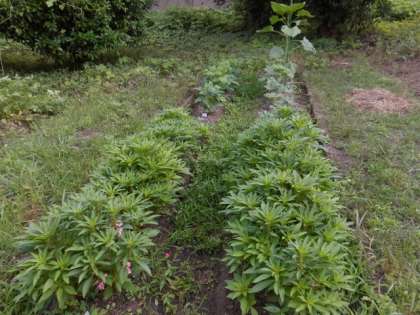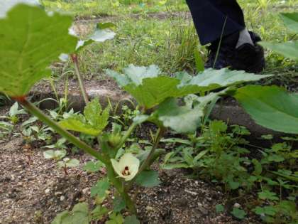 学校園の植物が,順調に育っています。ホウセンカのピンクや赤い花が咲き始めました。オクラにも黄色い花が咲いていて,小さな実ができ始めています。ヒマワリは,背が高くなって,葉の大きさは,大人の手のひらよりも大きいです。