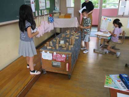 お菓子の箱を仲間分けする学習では,「転がる形と転がらない形」「角がある形と角がない形」「ボールみたいな形とそうじゃない形」など,いろいろな仲間分けの仕方が出てきました。