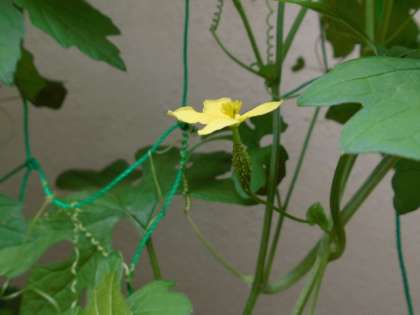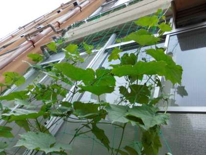 気温が高くなって,ツルレイシやヘチマがぐんぐん成長しています。ツルレイシの花がたくさん咲き始め,め花も見られるようになりました。実ができるのを楽しみにしています。